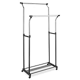 Double Adjustable Garment RackShort? Tall? This clothes rack does it all! Both bars adjust to whatever heightyou need (upto six feet!) for coats (extra "closet" at thefront door for Holiday guests), dresses, gowns, or shirts and pants. Bottom shelf keeps shoes and boots off floor, too. Wheels make it easytomove even when fully loaded. Steel,33 3/4 x 23 1/4 x 40-74 1/2".