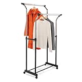 FINALLY, an easy way to supplement your small closets!This efficient "extra closet" is the first garment rack to allow double hanging of clothes without overlapping.Chrome and black matte steel with high impact plastic bases and smooth-rolling casters make this clothing rack both attractive and durable. Adjustable height bars can hang short and long garments. Locking swivel casters are easy to move. Chrome finish steel frame that is sturdy and rust-resistant. Extra-wide flared design so clothes won't overlap. Measures: 20.8"D x 32.8"W x 39.76" - 67"H.